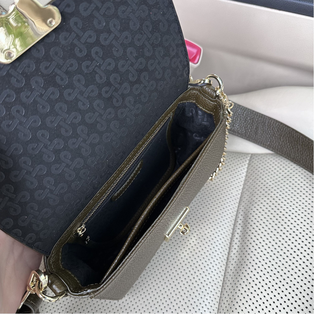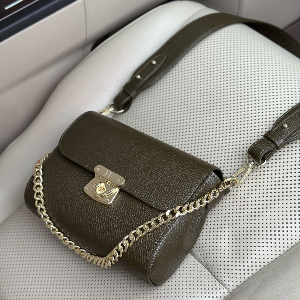 Women's leather crossbody bag made of genuine leather, hardware with galvanic coating and microfiber lining. The internal space of a bag is equipped with one spacious compartment, two patch pockets and one zipped pocket. The bag is closed with a clasp. The length of the strap is not adjustable. The kit also includes a storage bag.