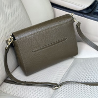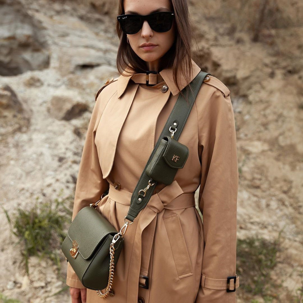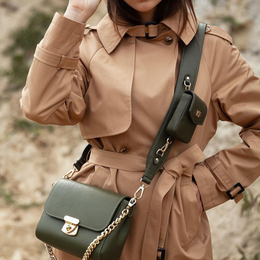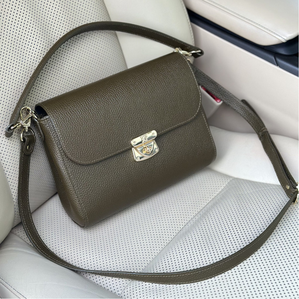 Women's leather crossbody bag made of genuine leather, hardware with galvanic coating and microfiber lining. The internal space of a bag is equipped with one spacious compartment, two patch pockets and one zipped pocket. The bag is closed with a clasp. The length of the strap is not adjustable. The kit also includes a storage bag.