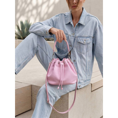 Women's leather Hobo bag made of genuine leather, hardware with galvanic coating and microfiber lining. The internal space of a bag is equipped with one spacious compartment and two patch-pockets and one zipper pocket. The bag is pulled together with a leather lace. The bottom of the bag is protected with metal legs. There is a long handle that allows you to wear the bag on the shoulder. The kit also includes a storage bag.