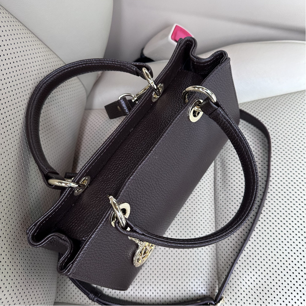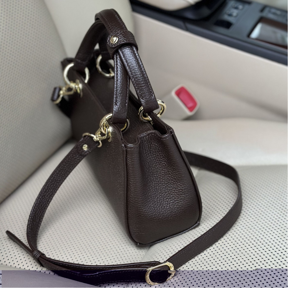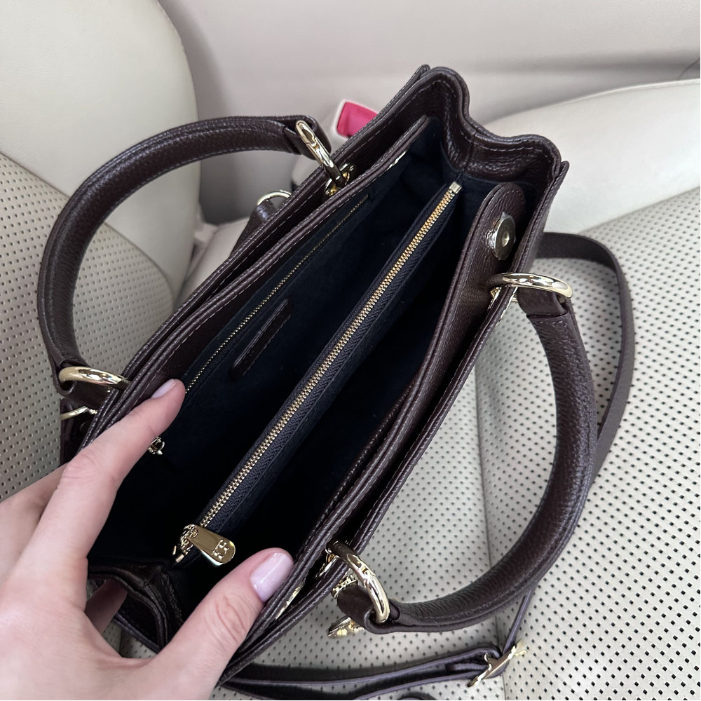 Women's leather bag made of genuine leather, hardware with galvanic coating and microfiber lining. The internal space of a bag is equipped with three spacious compartments and two patch-pockets and one zipper pocket. Closes with 2 buttons magnet. The bottom of the bag is protected with metal legs. The kit also includes a storage bag.
