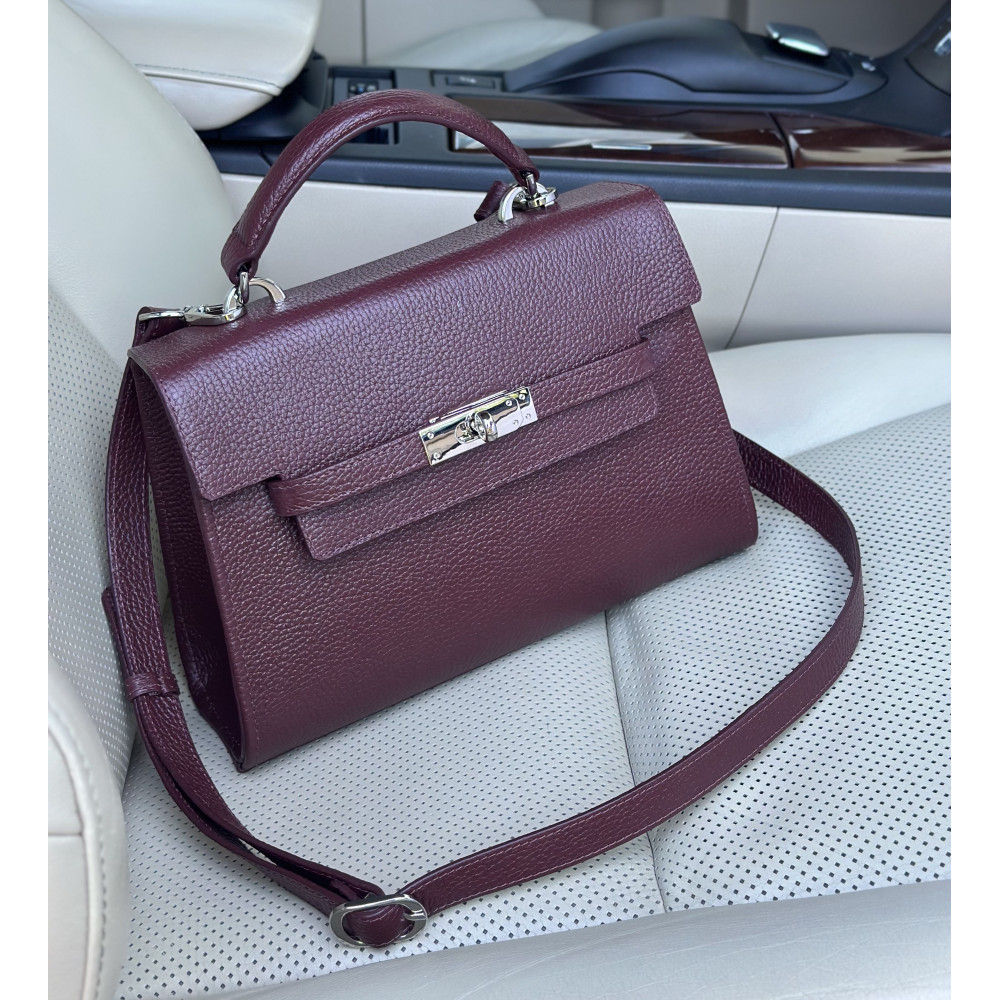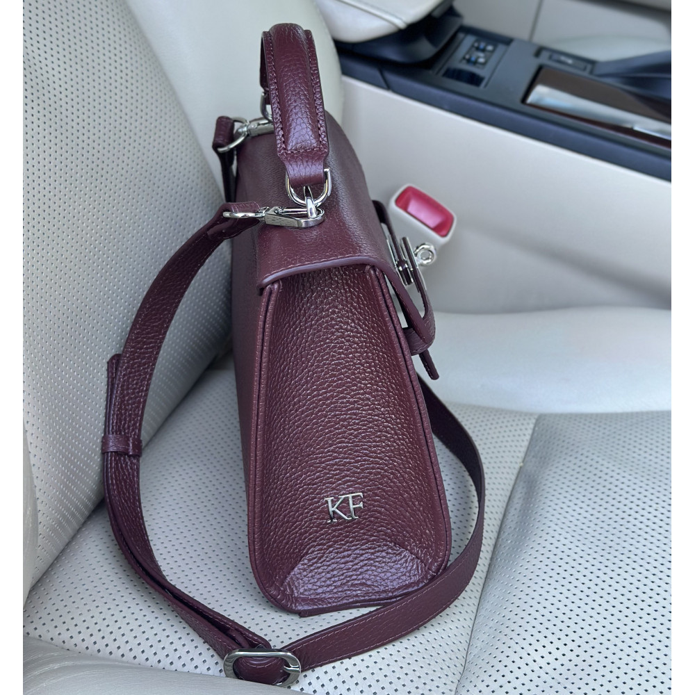 Women's leather bag made of genuine leather, hardware with galvanic coating and microfiber lining. The internal space of a bag is equipped with one spacious compartment, two patch-pockets and one zipper pocket. The bag is closed with a clasp. The bottom of the bag is protected with metal legs. There is a long handle that allows you to wear the bag on the shoulder. The kit also includes a storage bag.