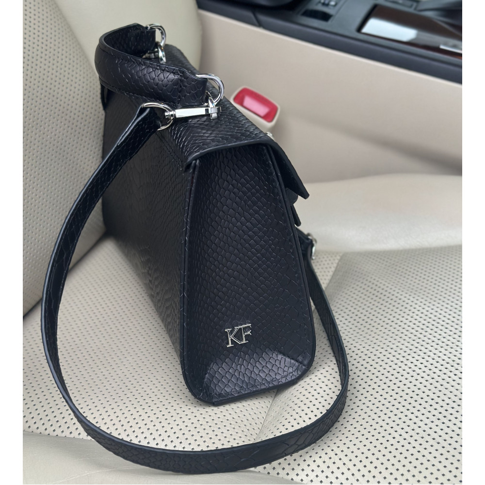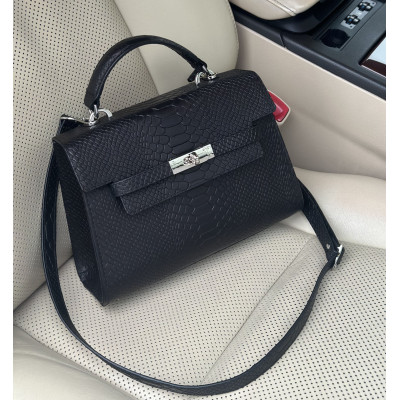 Women's leather bag made of genuine leather, hardware with galvanic coating and microfiber lining. The internal space of a bag is equipped with one spacious compartment, two patch-pockets and one zipper pocket. The bag is closed with a clasp. The bottom of the bag is protected with metal legs. There is a long handle that allows you to wear the bag on the shoulder. The kit also includes a storage bag.