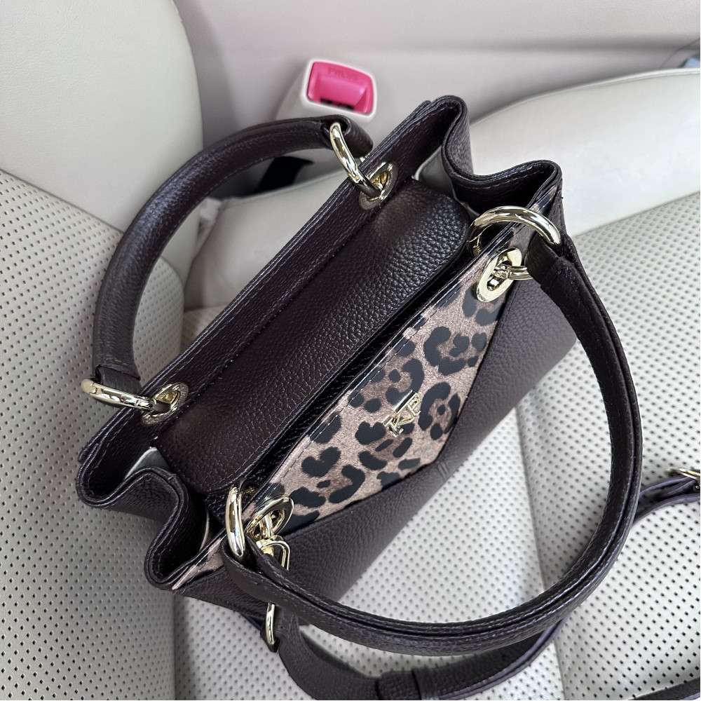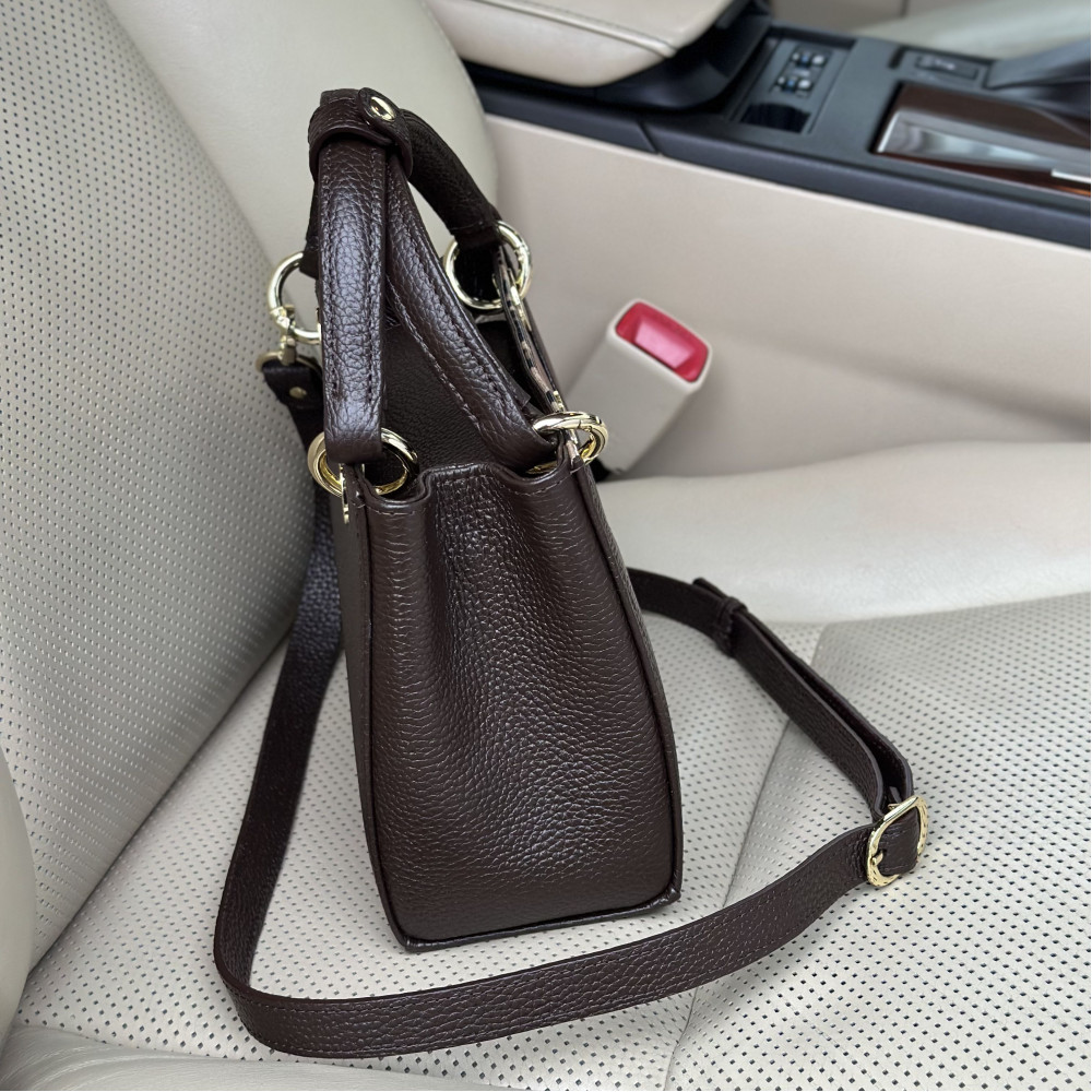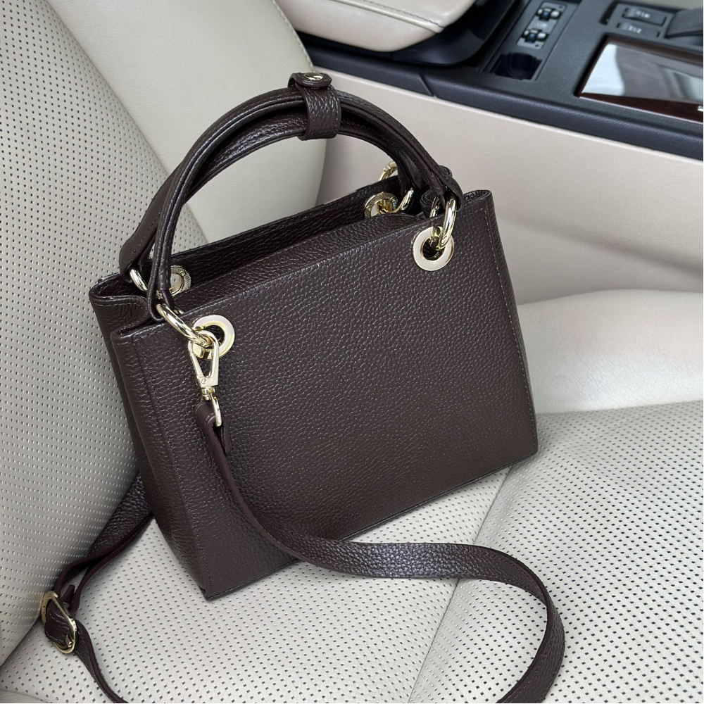 Жіноча шкіряна сумка з натуральної шкіри, фурнітурою з гальванічним покриттям і підкладкою мікрофібра. Внутрішній простір сумки облаштовано таким чином: три просторих відділення, одне з них на блискавці, є дві накладні кишені і одна кишеня на блискавці. Закривається на блискавку. Дно сумки захищено металевими ніжками. В комплект також входить мішок для зберігання.