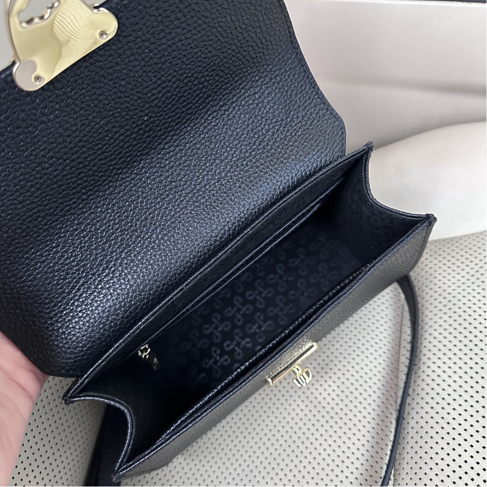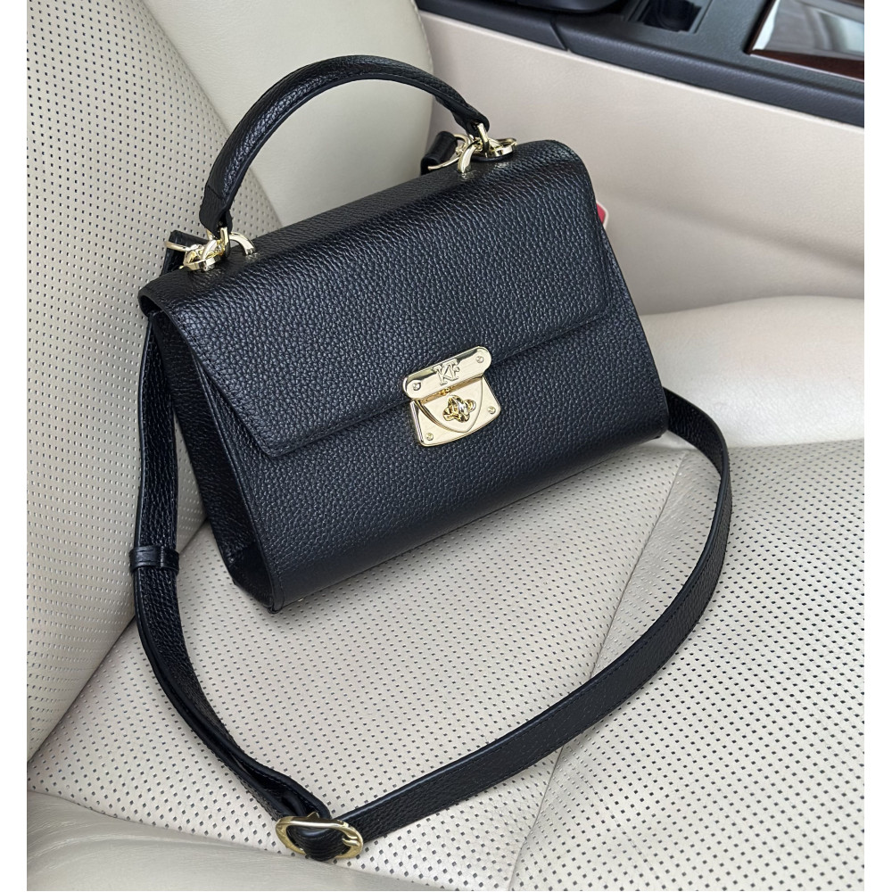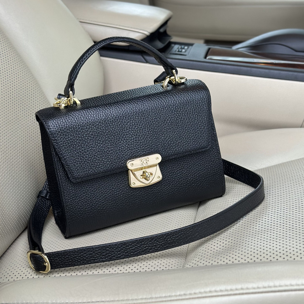 Жіночий шкіряний портфель з натуральної шкіри, фурнітурою з гальванічним покриттям і підкладкою мікрофібра. Внутрішній простір сумки облаштовано таким чином: одне просторе відділення, дві накладні кишені і одна кишеня на блискавці. Закривається сумка на застібку. Дно сумки захищено металевими ніжками. Є довга ручка, яка дозволяє носити сумку на плечі. В комплект також входить мішок для зберігання.
