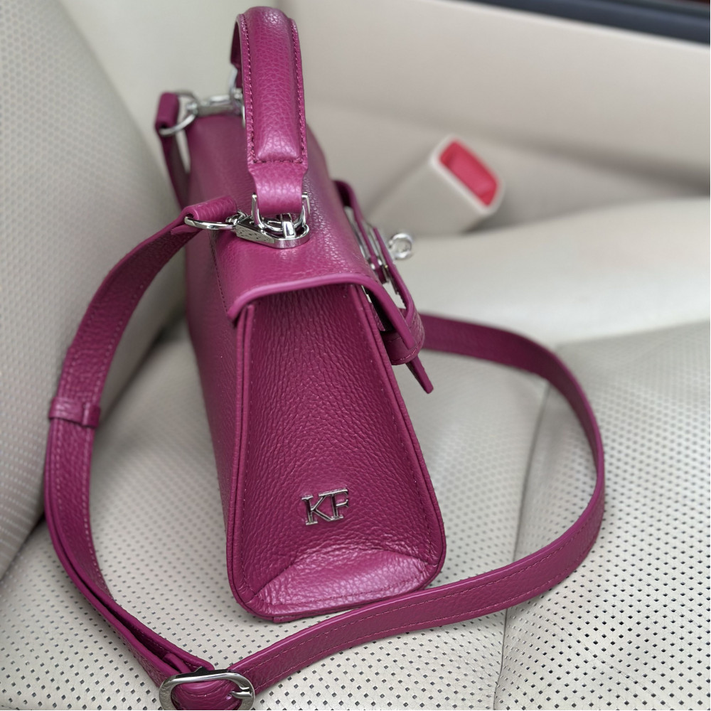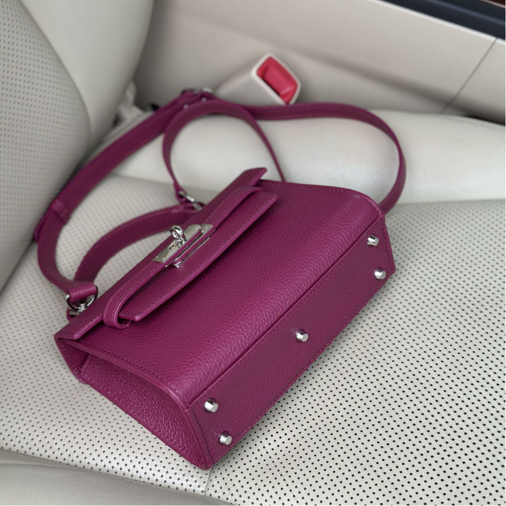 Жіноча шкіряна сумка з натуральної шкіри, фурнітурою з гальванічним покриттям і підкладкою мікрофібра. Внутрішній простір сумки облаштовано таким чином: одне просторе відділення, дві накладні кишені і одна кишеня на блискавці. Закривається сумка на застібку. Дно сумки захищено металевими ніжками. Є довга ручка, яка дозволяє носити сумку на плечі. В комплект також входить мішок для зберігання.